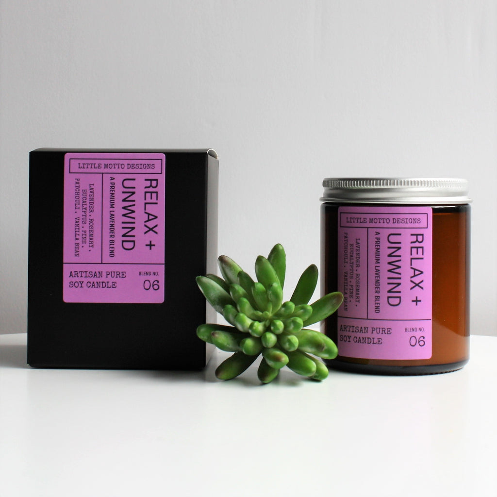 BLEND 06. RELAX & UNWIND - A premium lavender blend to relax and calm the senses. French Lavender, Rosemary, Eucalyptus, Pine, Patchouli and Vanilla Bean combine for the ultimate in relaxation. Great for bath and bedtime.