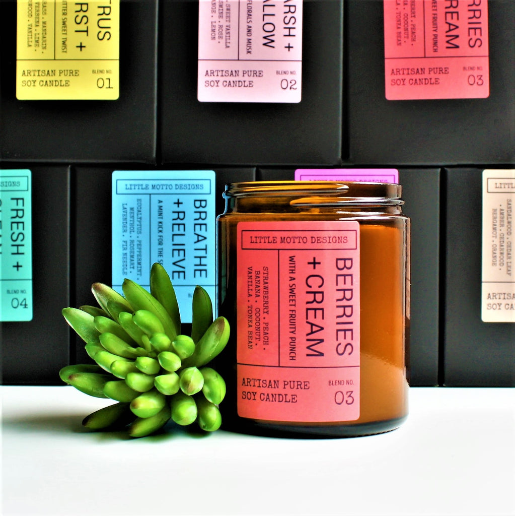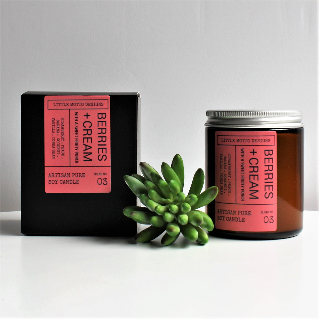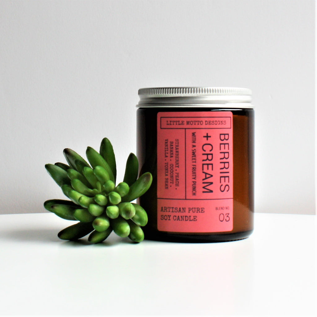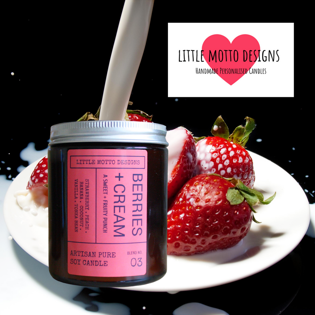 BLEND 03. BERRIES & CREAM - A luxuriously creamy blend of Strawberry, Peach, Banana, Coconut, Vanilla and Tonka Bean. This candle fragrance packs a sweet fruit punch. Perfect to enjoy with a glass of bubbles in hand.