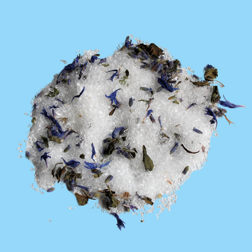 A mint kick for the senses. Ingredients: Premium Grade Epsom Sea Salt (Magnesium Sulphate), Dried Lavender, Dried Peppermint Leaves, Blue Cornflower Petals, Eucalyptus, Peppermint & Menthol Parfum.