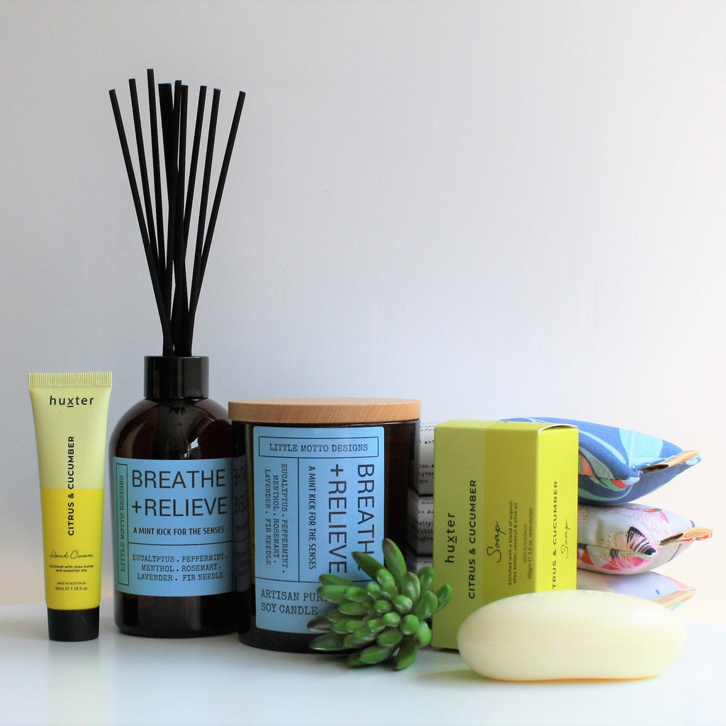 BLEND 05. BREATHE & RELIEVE - A mint kick for the senses. This uplifting sinus reliever blend is a mix of Eucalyptus, Peppermint, Menthol, Rosemary, Lavender and Fir Needle. Close your eyes, breathe deep and imagine a rich forest.
