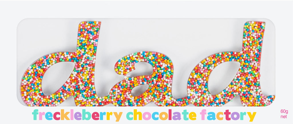 FRECKLEBERRY CHOCOLATE: Belgian milk chocolate freckle word 'Dad'.