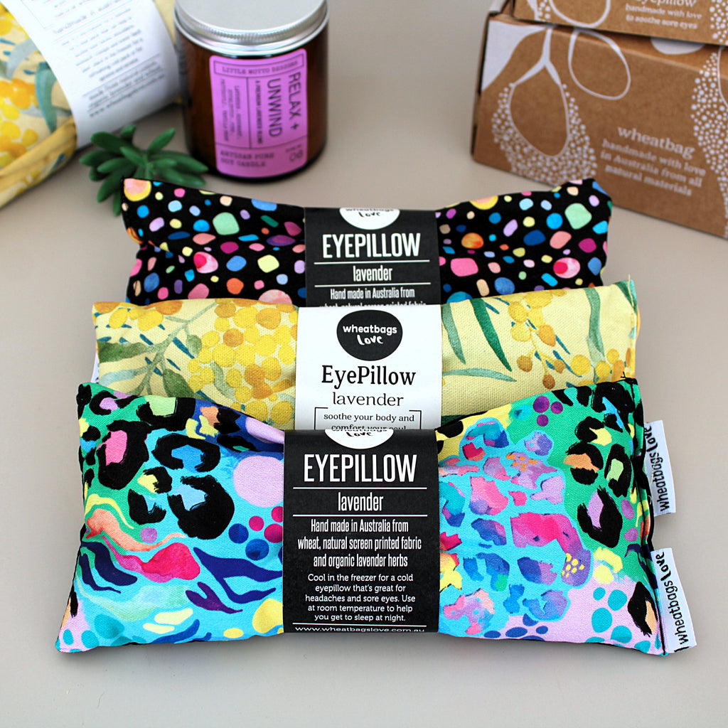 This bright and eye catching eye pillow is packed full of aromatic organic lavender and is 100% cotton. The Black Pebbles print design is part of the stunning Kasey Rainbow range, created in collaboration with the talented Brisbane artist herself.