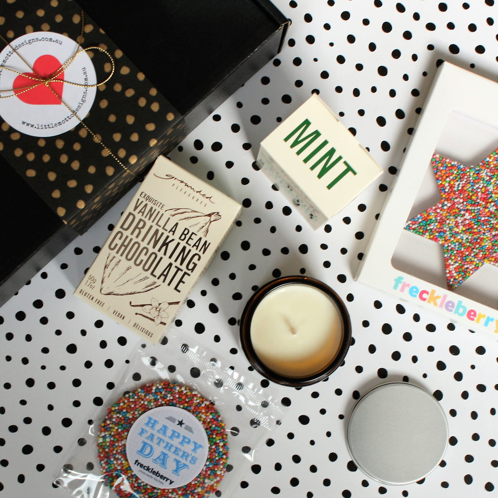 Indulgent Vanilla Bean and French Mint hot chocolate, delicious Freckleberry treats and one of our best selling unisex candles, 'Peace & Harmony'.