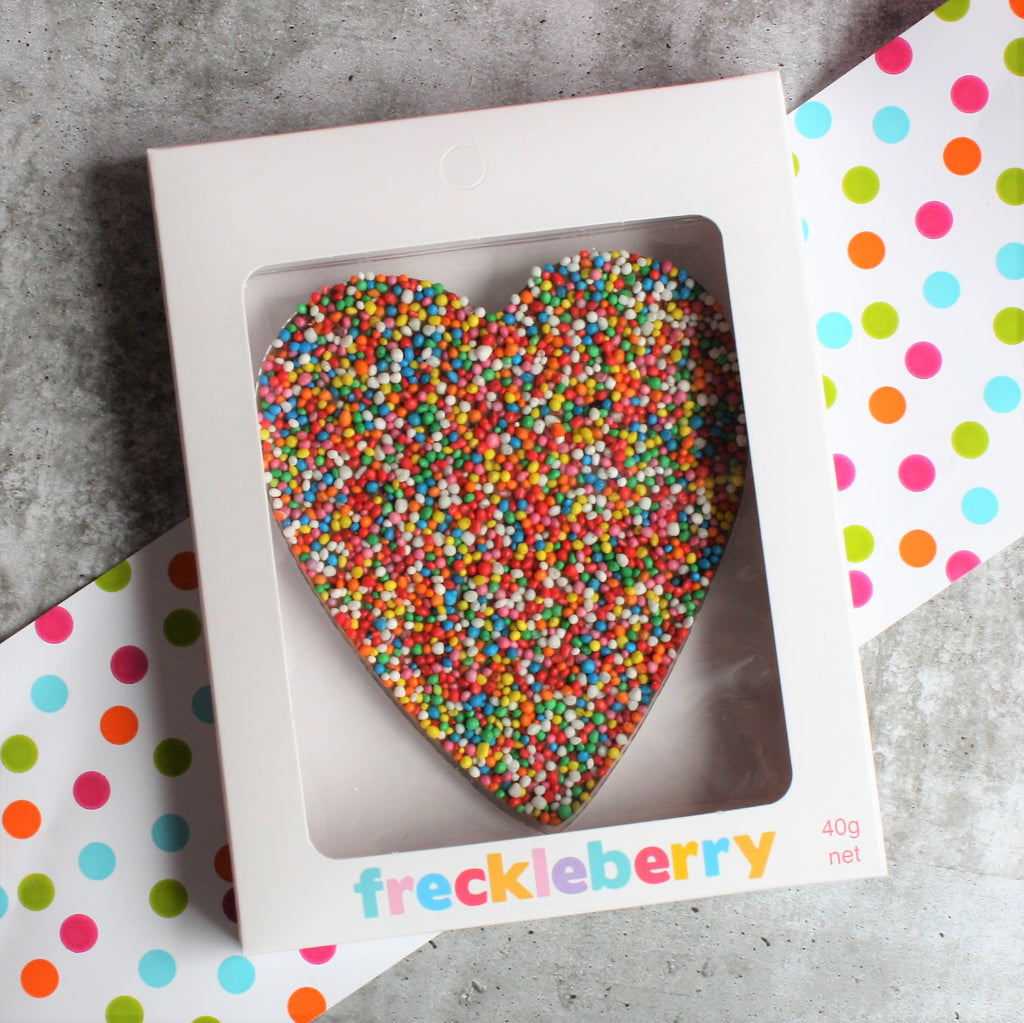 FRECKLEBERRY CHOCOLATE INGREDIENTS: Milk Chocolate (sugar, cocoa butter, milk powder, cocoa mass, soy lecithin, vanillin ), sugar, tapioca starch, glazing agent (903), colours (102, 110, 122, 123, 124, 133). Made in Geelong, Victoria.