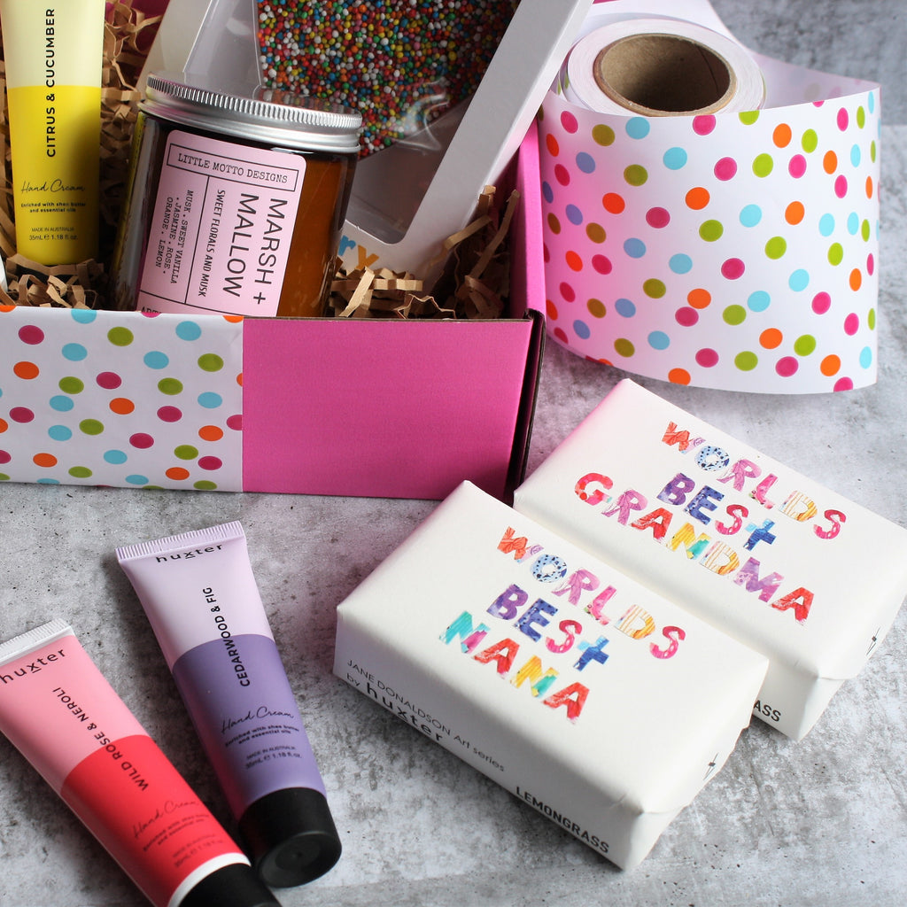 Our PAMPER hampers are presented in premium matte pink or black boxes and finished with a decorative wrap and metallic gold chord as pictured. All hamper items are selected for their quality and are all made by Australian owned businesses.