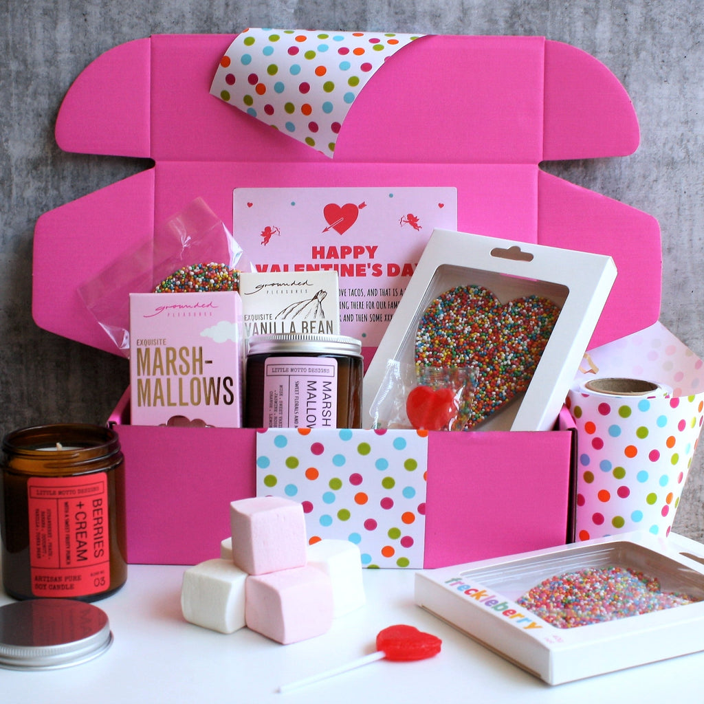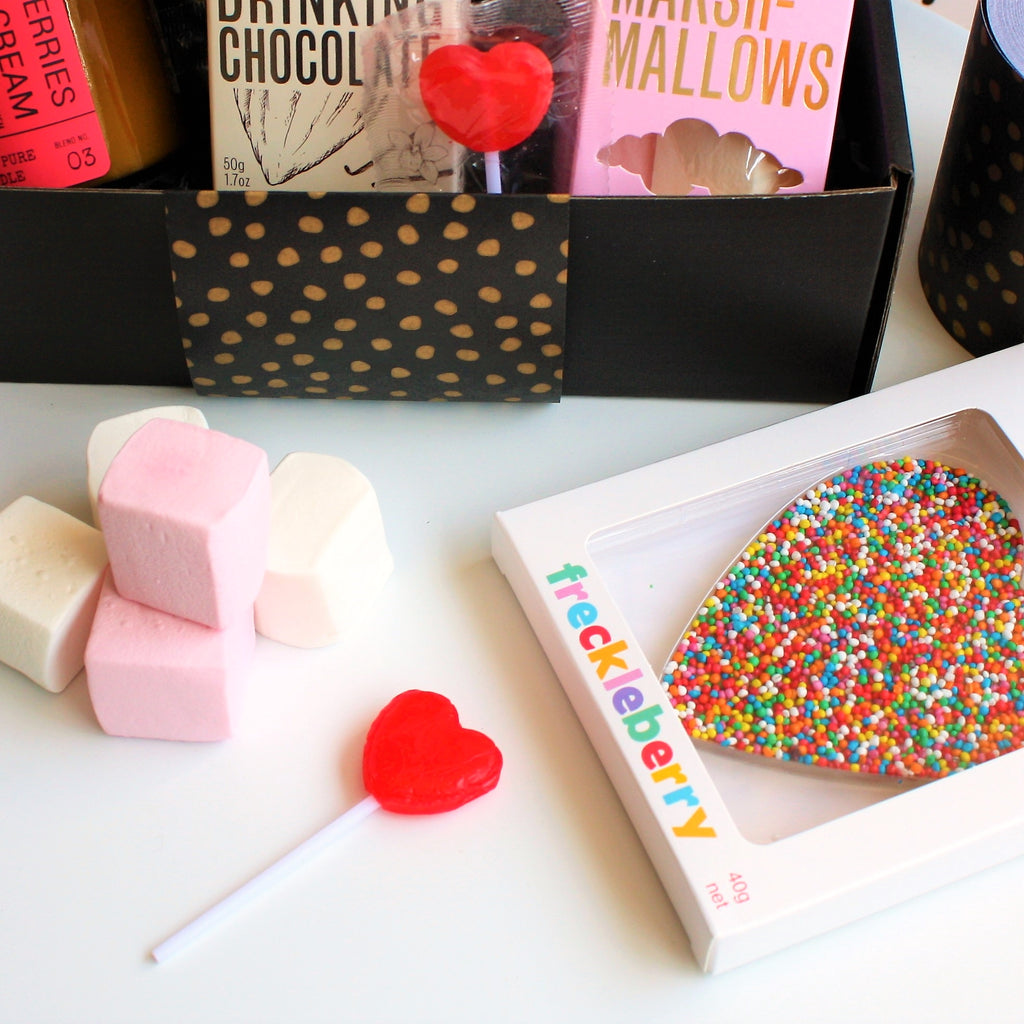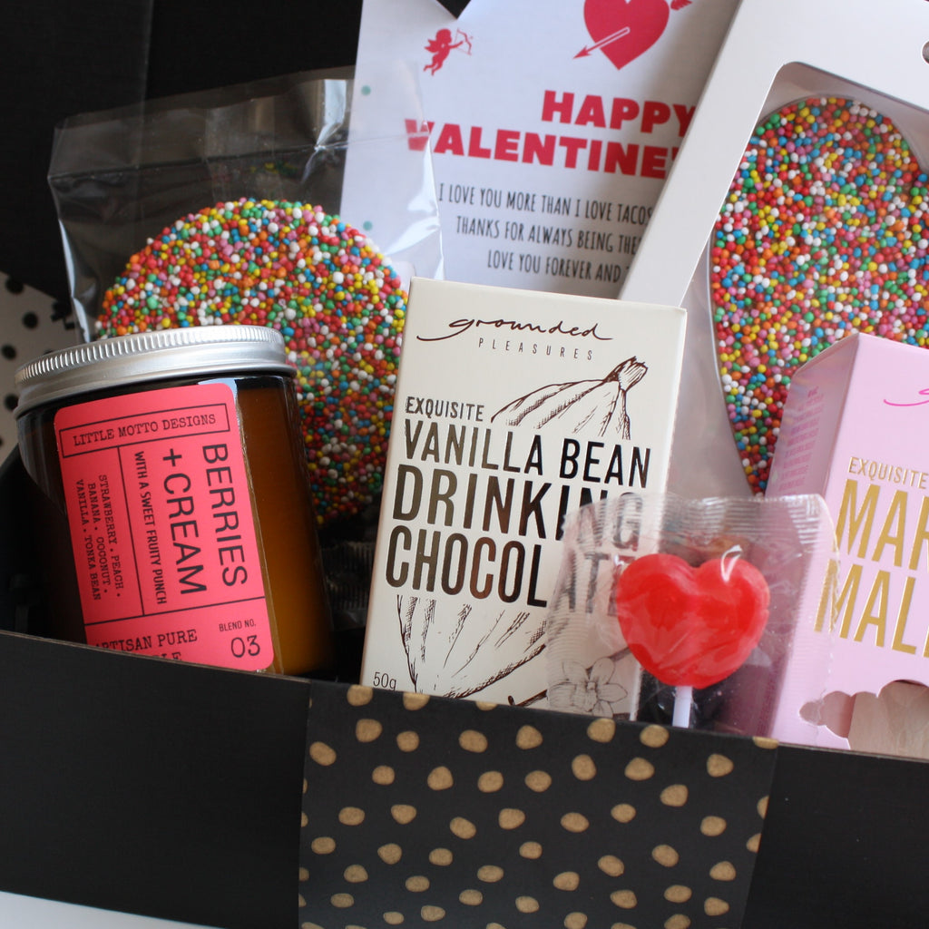 Our VALENTINE'S DAY hampers are presented in a premium matte black or pink box and finished with a decorative wrap and metallic gold chord as pictured. Hamper items are selected for their quality and are made by Australian businesses.